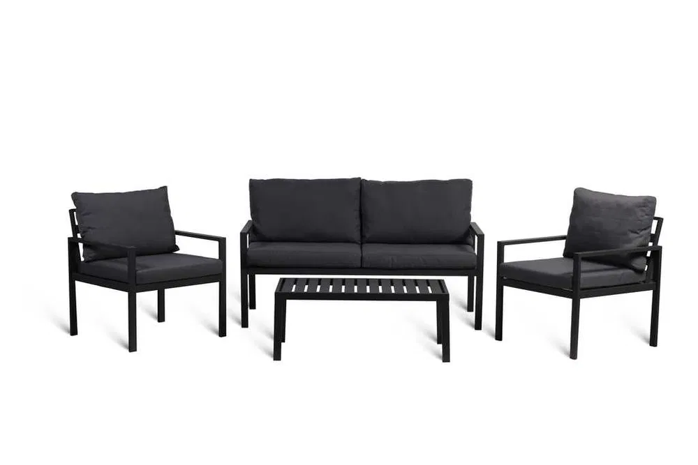 Zestaw w kolorze ciemnoszarym, poduszki jasnoszare lub ciemnoszare.